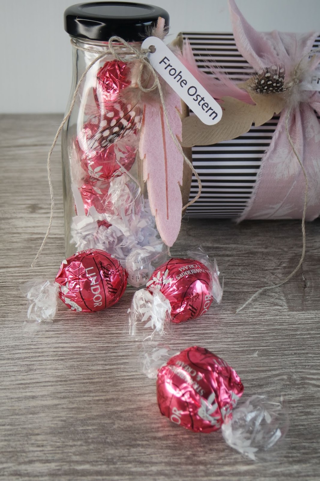 Ihr seht schon, wieder ein Eierkarton, gefüllt mit weißer Papierwolle und mit mint farbenden Lindor Kugeln (weil sie farblich so perfekt passen). Um den Karton herum ein Streifen Papier und das schöne Feder-Band. Obendrauf dann eine echt graue Feder, eine Filzfeder und …